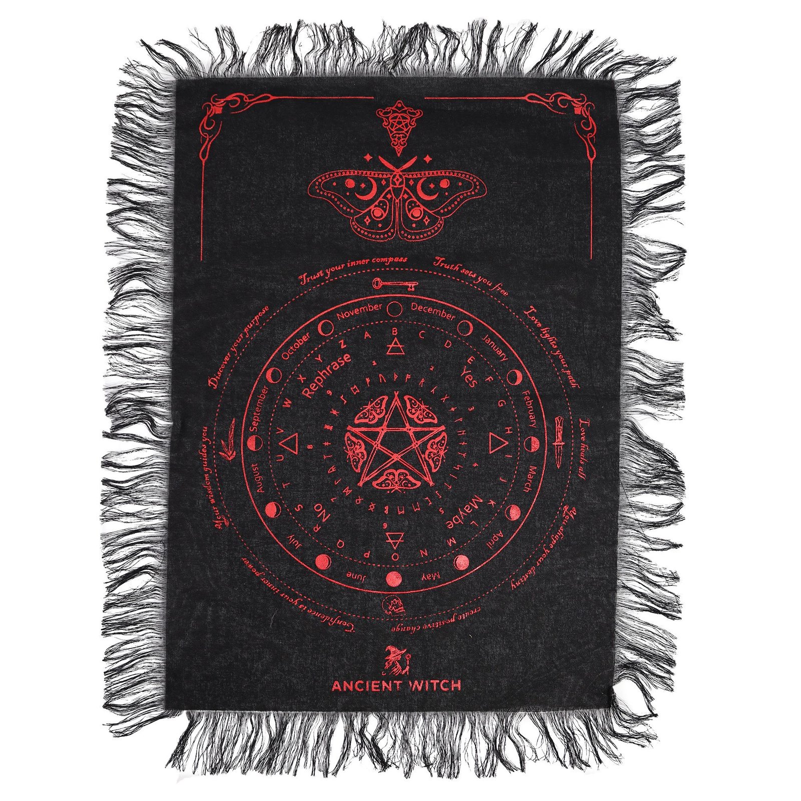 Create a bold and atmospheric space for your readings with the Ancient Witch Mystic Moth Pendulum Divination Cloth in Black & Blood Red. The striking red design stands out against deep black fabric, featuring a detailed mystic moth above a symbolic divination layout that draws attention and enhances focus.